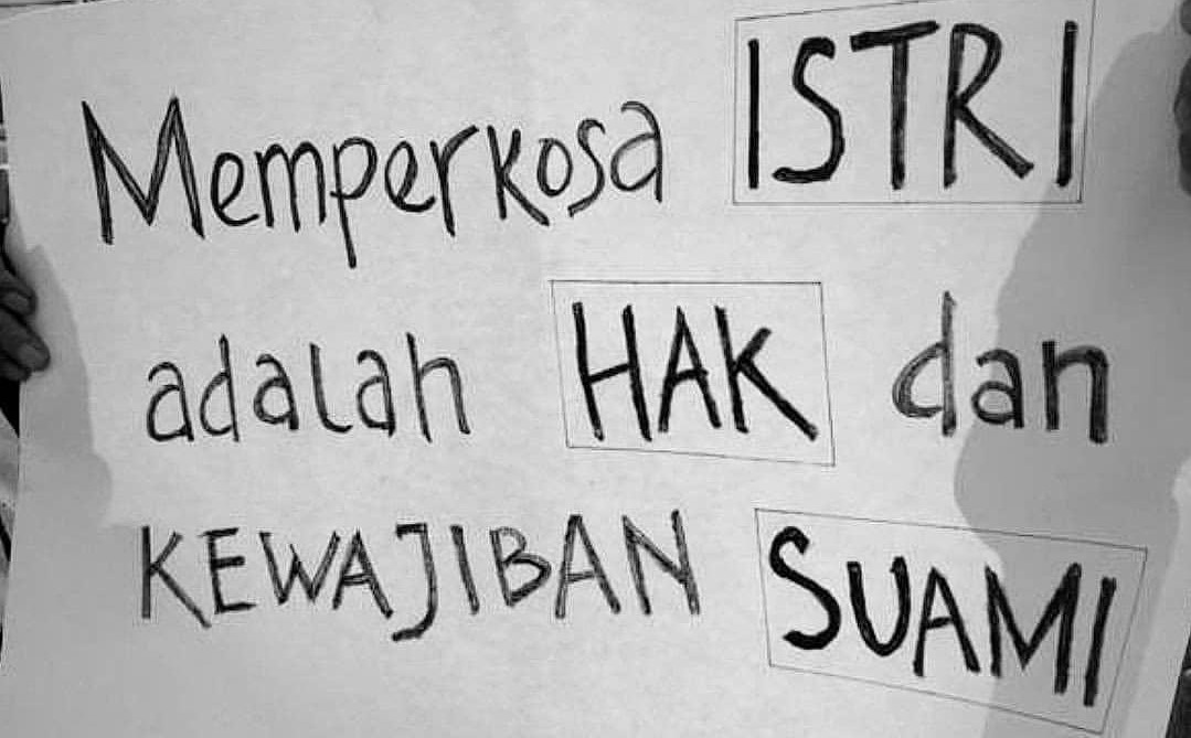 lalu saya melihat berseliweran poster di media sosial dengan bertuliskan “Memperkosa Istri adalah hak dan kewajiban Suami". Poster itu dibawa oleh salah seorang dalam aksi massa damai Mujahid